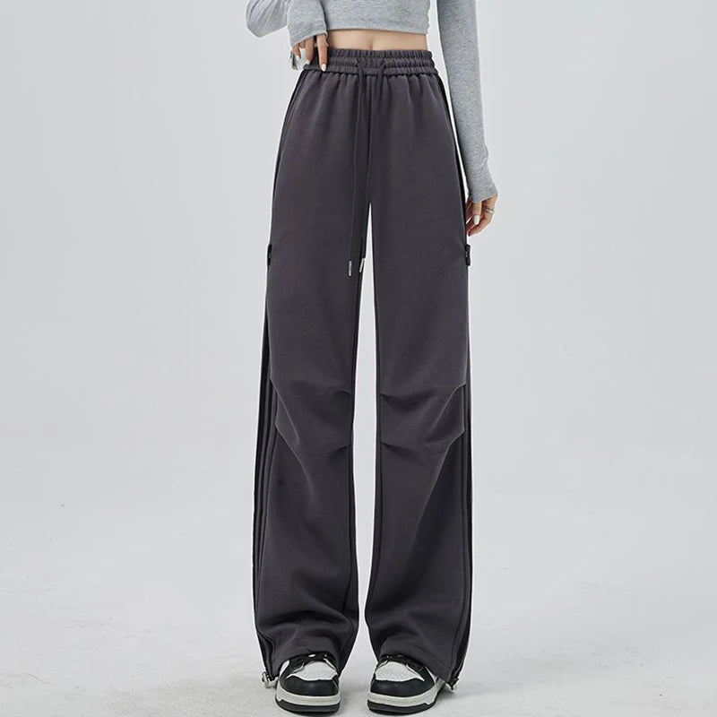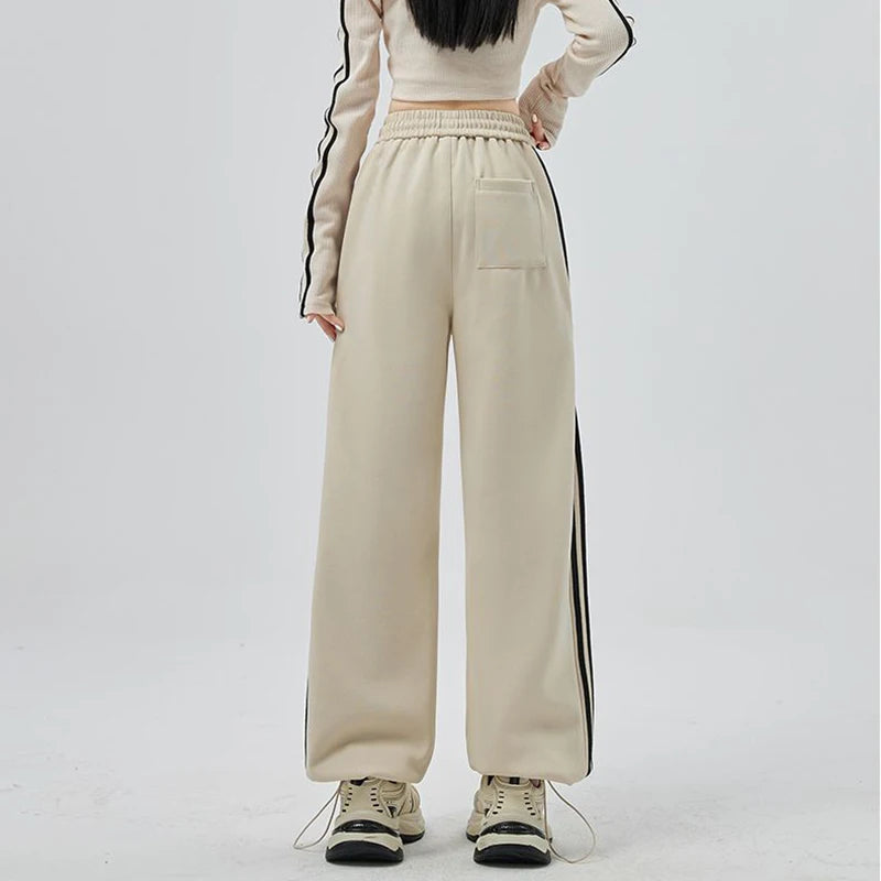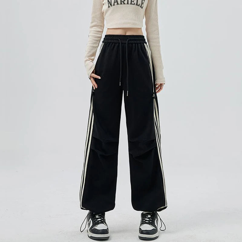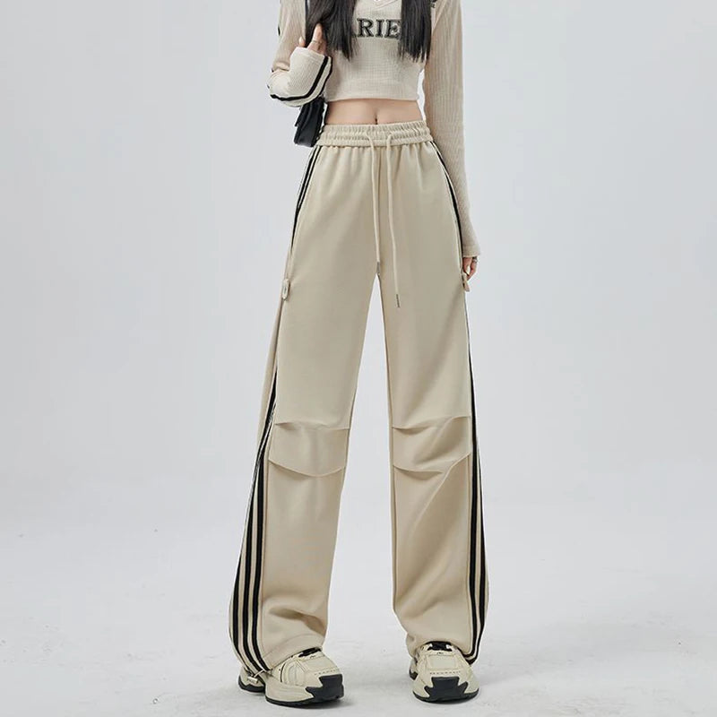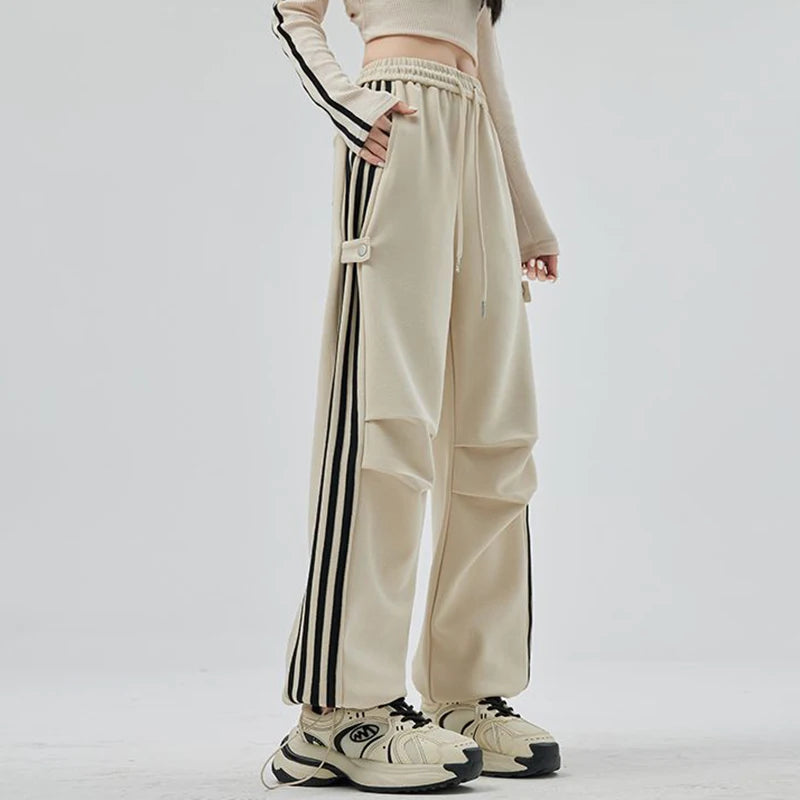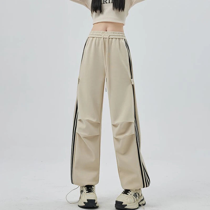 Girls Fashion High Waist Straight Leg Cargo Pants Female Korean Loose Pants Lady Casual Striped Quick Drying Trousers