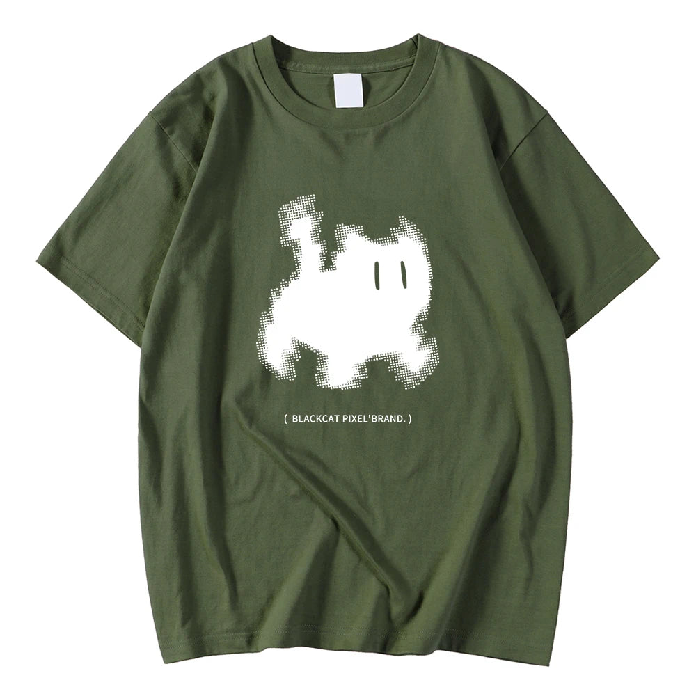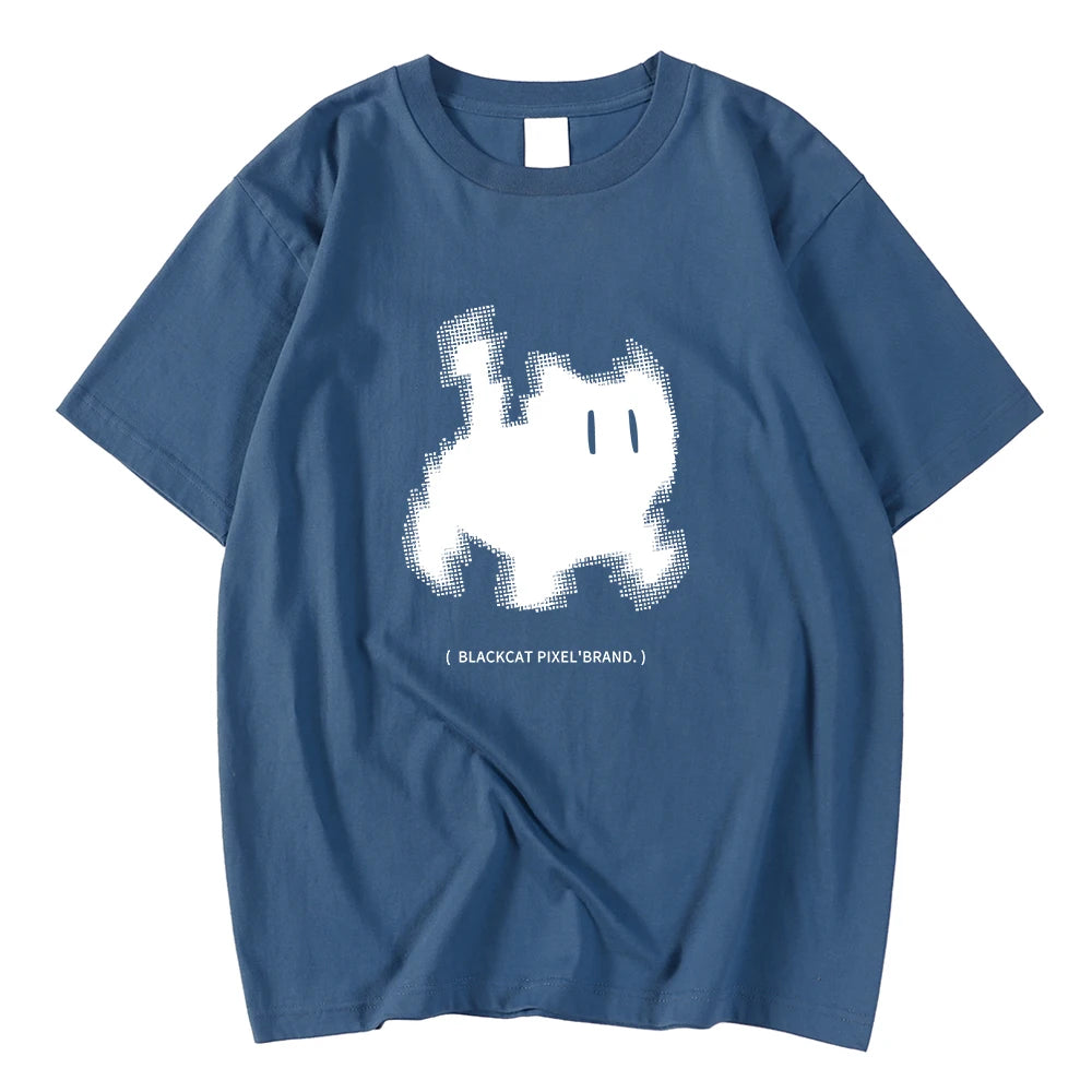 Korean Fashion Womens T-Shirts Black Cat Pixel Cartoons Printing Tops Comfortable Soft O-Neck Loose Short Sleeve Female Clothes
